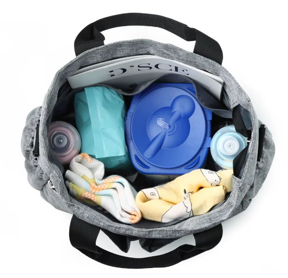 Le sac à langer , gris ou noir, est conçu pour organiser facilement les affaires de bébé. Il possède de nombreuses poches accessibles et sécurisées pour simplifier vos déplacements. La grande poche principale accueille vêtements et couches ; des compartiments isolés maintiennent les biberons à température ; des poches extérieures permettent d'accéder rapidement aux lingettes et jouets.